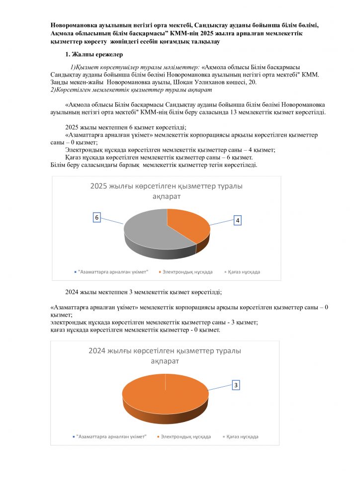 Новоромановка ауылының негізгі орта мектебі, Сандықтау ауданы бойынша білім бөлімі, Ақмола облысының білім бөлімі» КММ-нің 2025 жылға арналған мемлекеттік қызметтер көрсету жөніндегі есебін қоғамдық талқылау